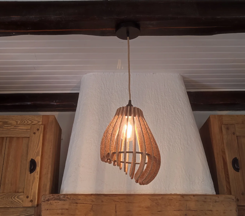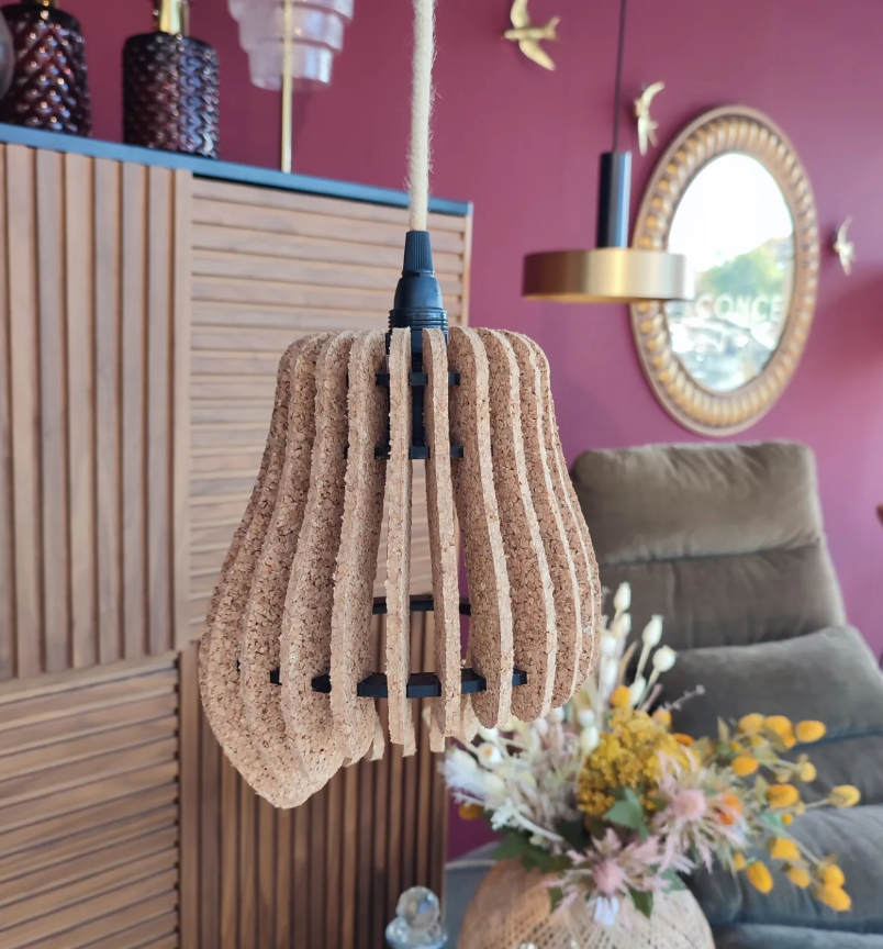 Chaque pièce mêle liège naturel et lumière douce, dans une approche où artisanat et design contemporain se rencontrent.